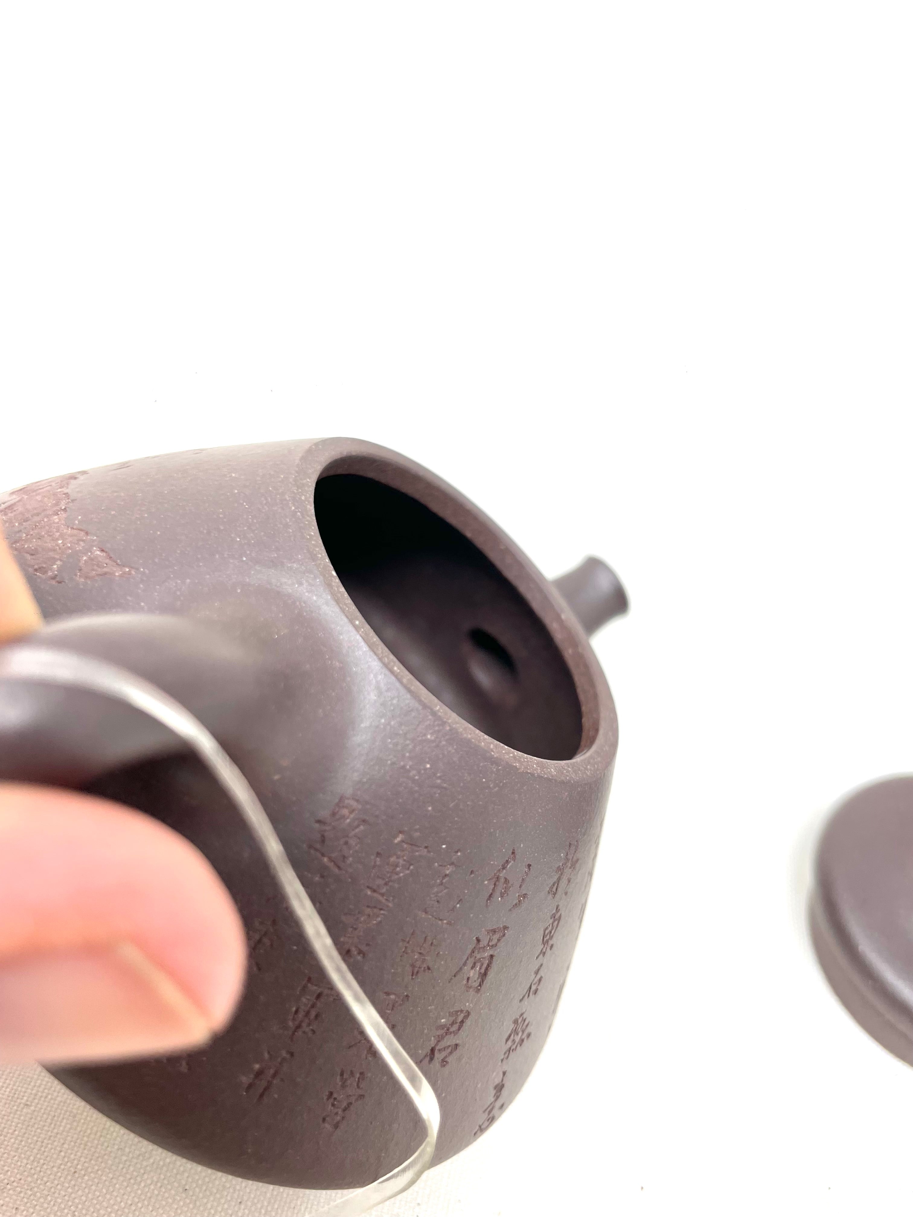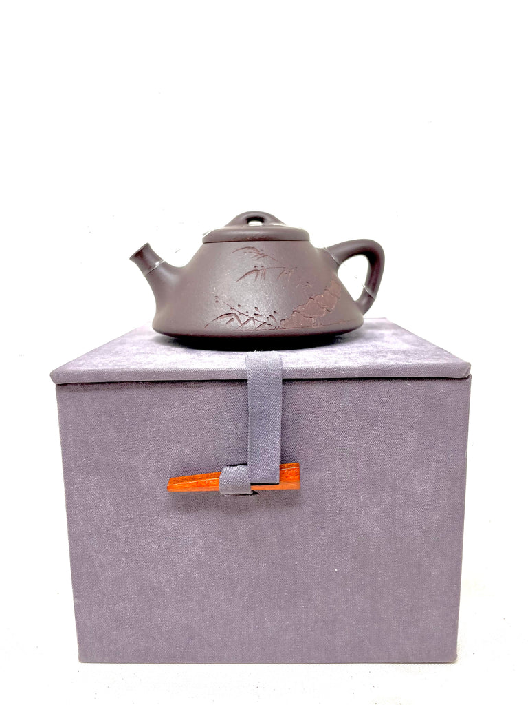 Spettacolare teiera Yixing di argilla Zini viola scelta personalmente durante uno dei nostri ultimi viaggi in Cina. Incantevole il disegno inciso a mano sul proflo della teiera che dal lato opposto presenta ideogrammi cinesi, presenta 3 piccoli piedi che la la mantengono rialzata e le permettono di far fluire ancora meglio l'acqua rimanente nel tavolo da gon fu cha. Un vero e proprio oggetto d'arte, creato con la tradizionale tecnica di lavorazione dell'argilla Yixing, nota per la sua qualità e bellezza.